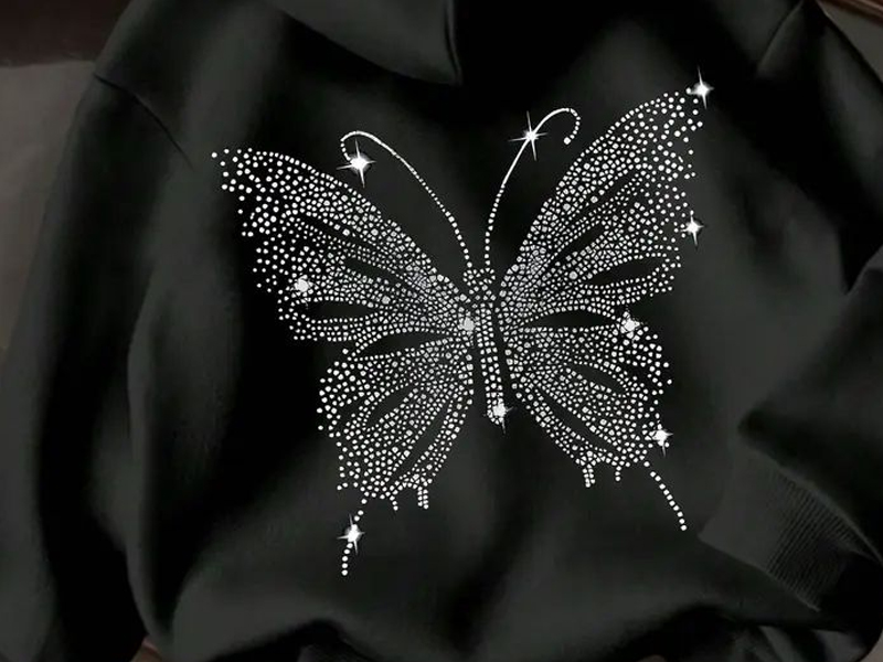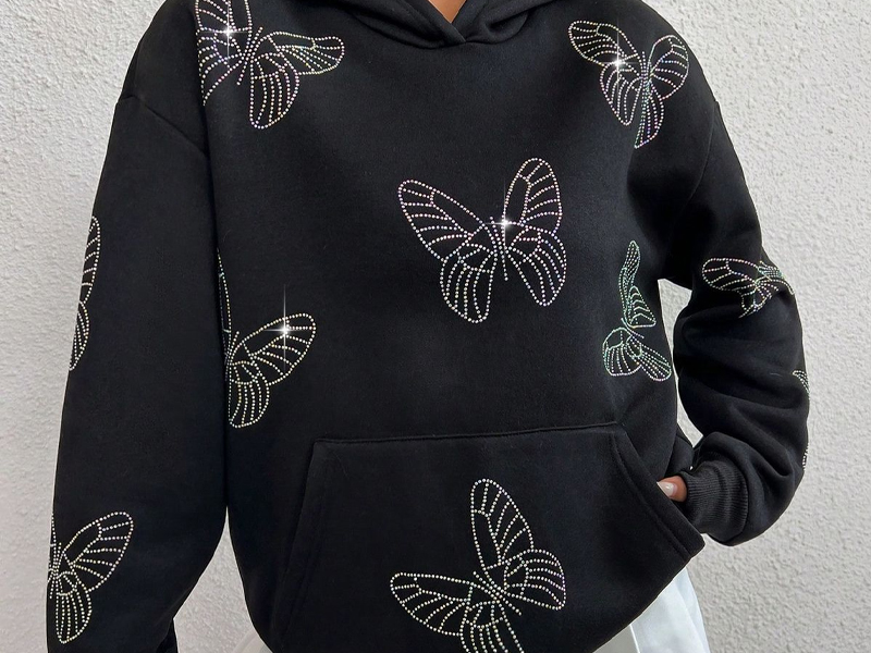 · Украшение стразами: Каждая толстовка украшена аккуратно расположенными стразами, которые добавляют нотку гламура к прочному уличному стилю. Украшения переливаются светом со всех сторон, создавая лёгкое мерцание, которое плавно переходит от дневного к вечернему образу.